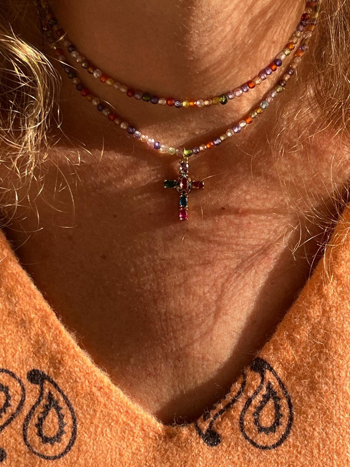 Il est composé de fines perles de pierres semi-précieuses multicolores (tourmaline) et d'un pendentif "croix" ou "champignon" en plaqué or et petits strass multicolores Swarovski.